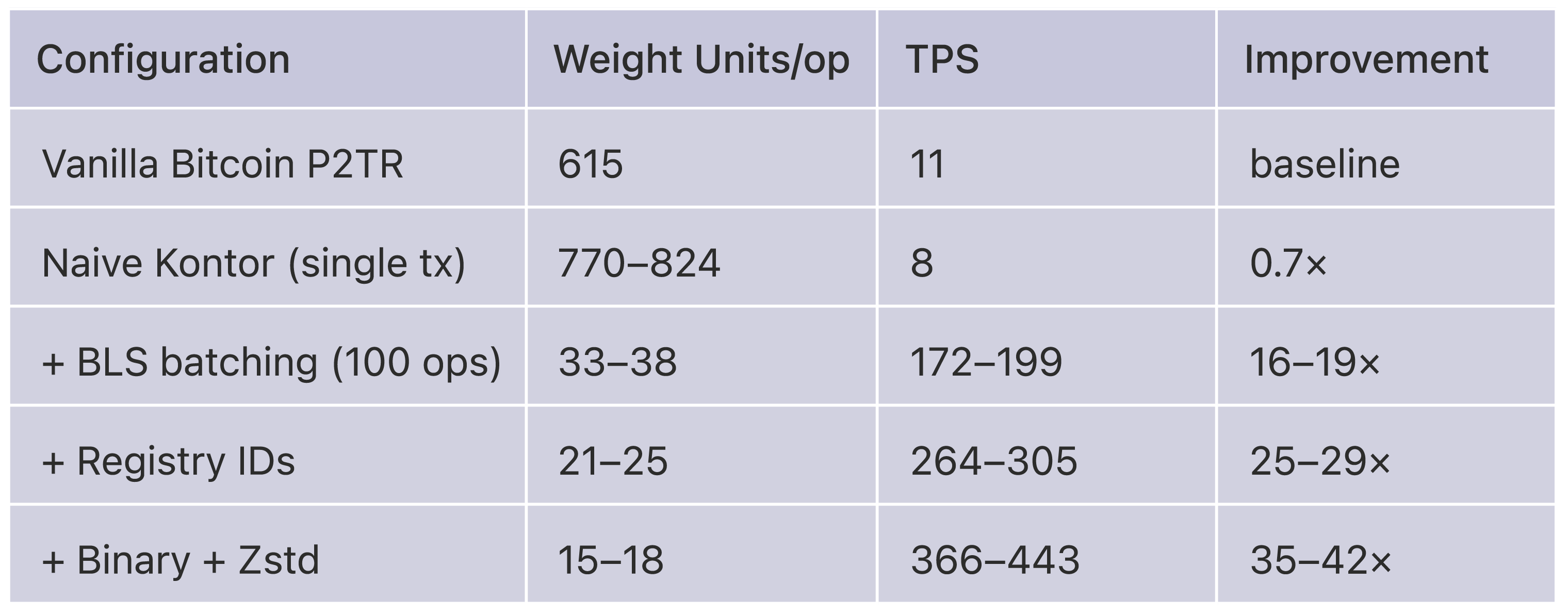 At batch sizes of 1,000–10,000 operations, Kontor achieves 5–10 weight units per operation, supporting 700–1,300 TPS. That's over 100× more efficient than vanilla Bitcoin transactions.